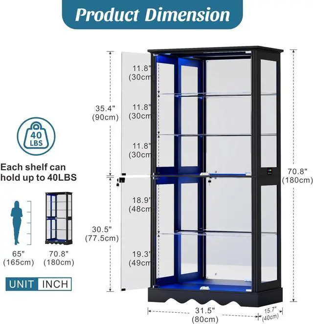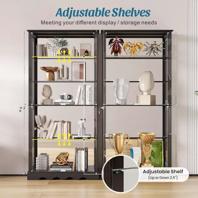 71" Tall 5-Tier Display ShelfThis tempered glass display case offering ample room to showcase collectibles, figures, medal, and decor while keeping them dust-free and neatly organized. Adjustable shelves allow flexible display for items of different heights