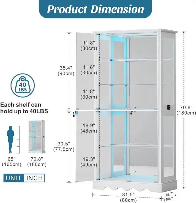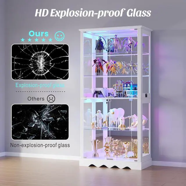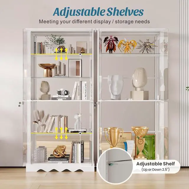 71" Tall 5-Tier Display ShelfThis tempered glass display case offering ample room to showcase collectibles, figures, medal, and decor while keeping them dust-free and neatly organized. Adjustable shelves allow flexible display for items of different heights