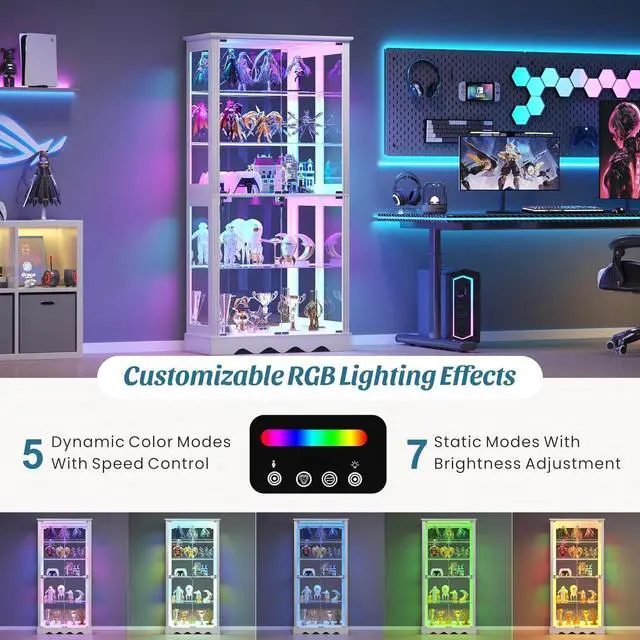 RGB Lighting with Human SensorThe glass bookcase built-in LED strip offers 5 dynamic RGB effects and 7 static color modes. The smart motion sensor lights up automatically when you approach, adding a modern, interactive touch to your display
