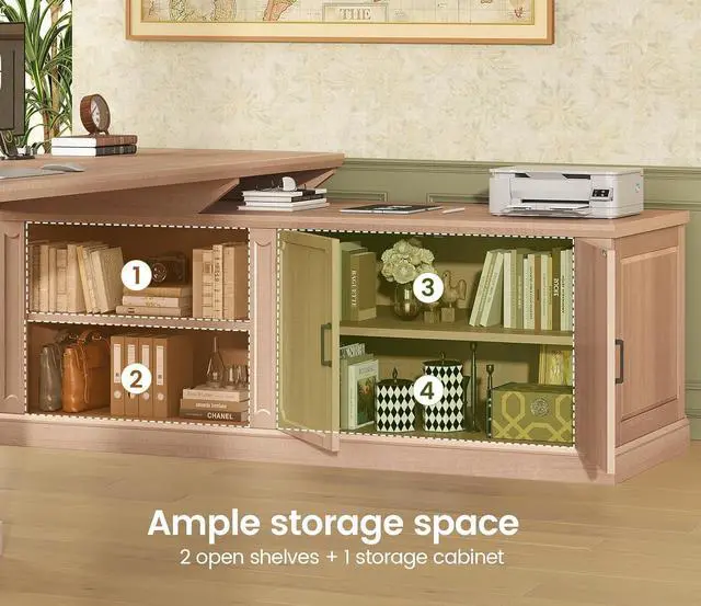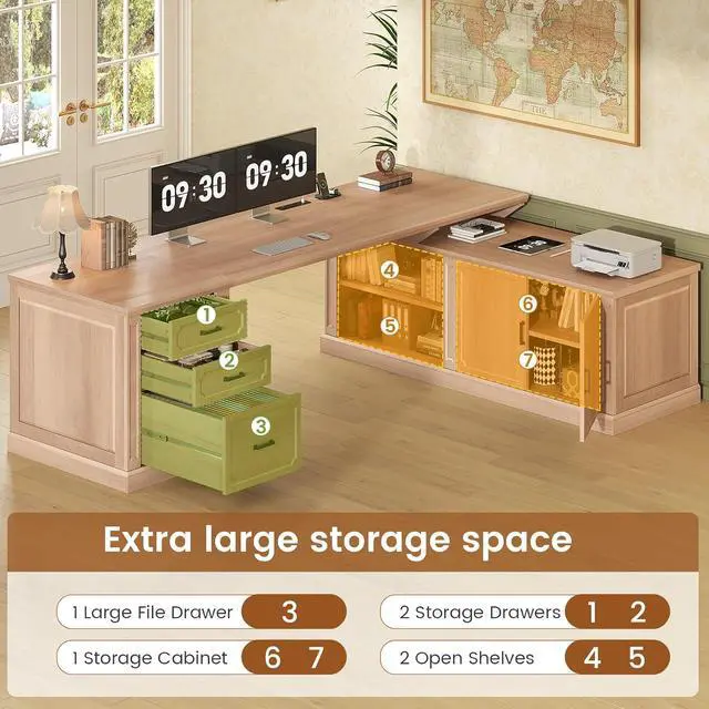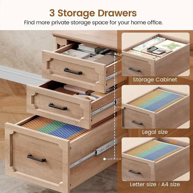 Ample Storage SpaceComing with 1 file drawer, 2 drawers,1 storage cabinet and 2 open shelves. File cabinet can hold letter/A4/legal files. This solid constructed l shaped desk with drawers could hold printers, scanners, fax machines and any other office machines, keeps printer or scanner within easy reach of your desk to free up work space.