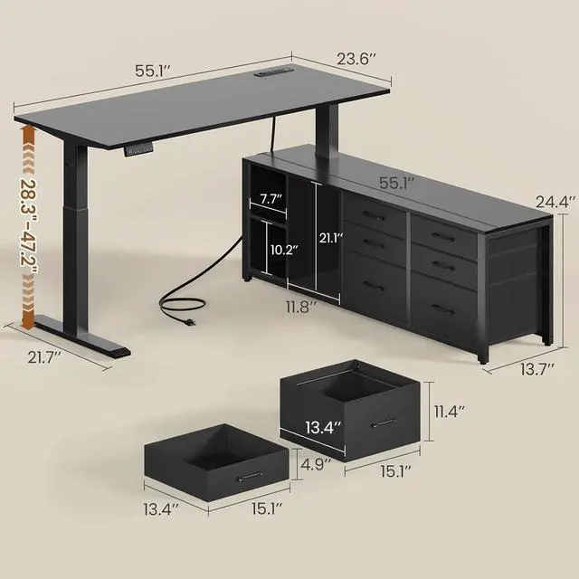 L Shaped Electric Standing Desk, 55" x 55" Height Adjustable Office Executive Desk with 6 Fabric Drawers and Storage Shelves, Sit Stand Computer Desk with Power Outlet for Home Office (Black)