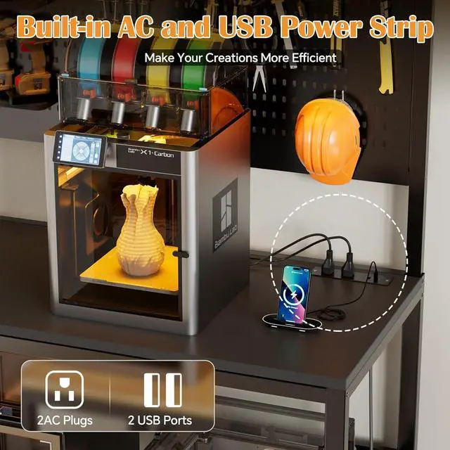 Integrated AC/USB Power Hub: Power at Your Fingertips:The desktop integrates a convenient AC outlet and USB charging port, allowing you to directly power your printer, laptop, mobile phone, or other tools. Streamline cabling and say goodbye to tangled wires, making your work area safer and tidier.