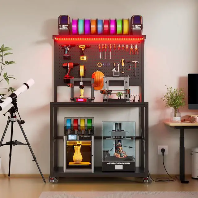 3D Printer Stand with Filament Storage Workstation, Large Mobile 3D Printer Workbench with AC/USB Power Hub and LED Lights, Heavy Duty Printer Shelf with Pegboard for Studio Garage,Black