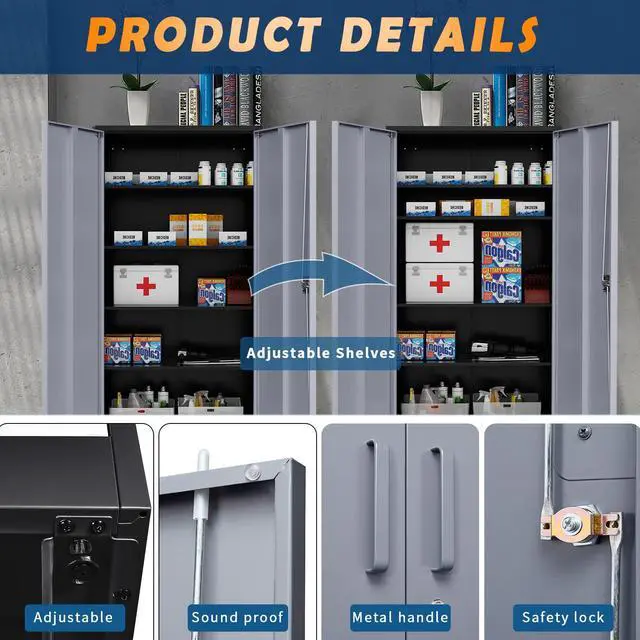 Secure and Practical Design- Equipped with a high-grade lock and 4 adjustable shelves, our tall metal cabinet provides adaptability and convenience. The lock ensures the safety of your valuables, and the adjustable shelves allow you to create a unique storage space to suit your needs.