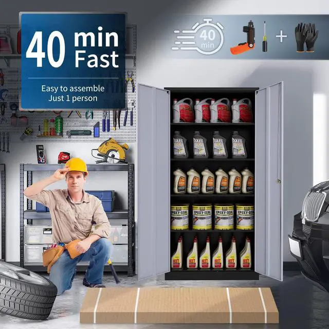 Easy to Assemble- The garage storage cabinet is a knock-down structure, and the package comes with detailed assembly instructions, making it easy to assemble. With 2 wing doors that have a 180° opening angle, you can easily access your items.