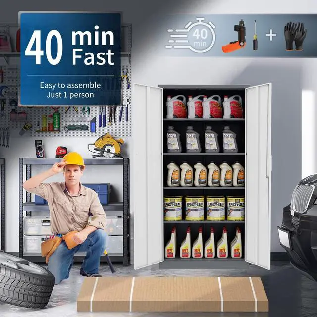 Easy to Assemble- The garage storage cabinet is a knock-down structure, and the package comes with detailed assembly instructions, making it easy to assemble. With 2 wing doors that have a 180° opening angle, you can easily access your items.