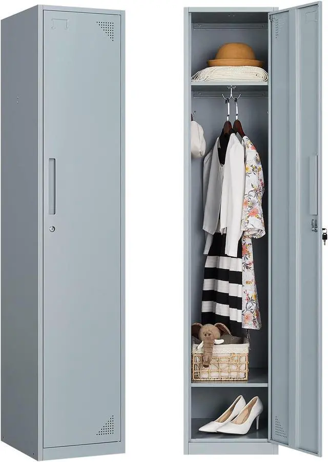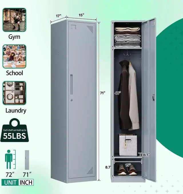 Ample Storage SpaceAFAIF metal locker measures H71" x W15" x D17" with 1 lockable door and 2 shelves for classified storage. The 48" height allows for hanging clothes, hats, bags, and more.