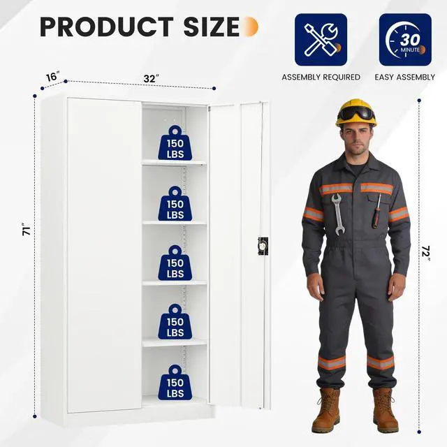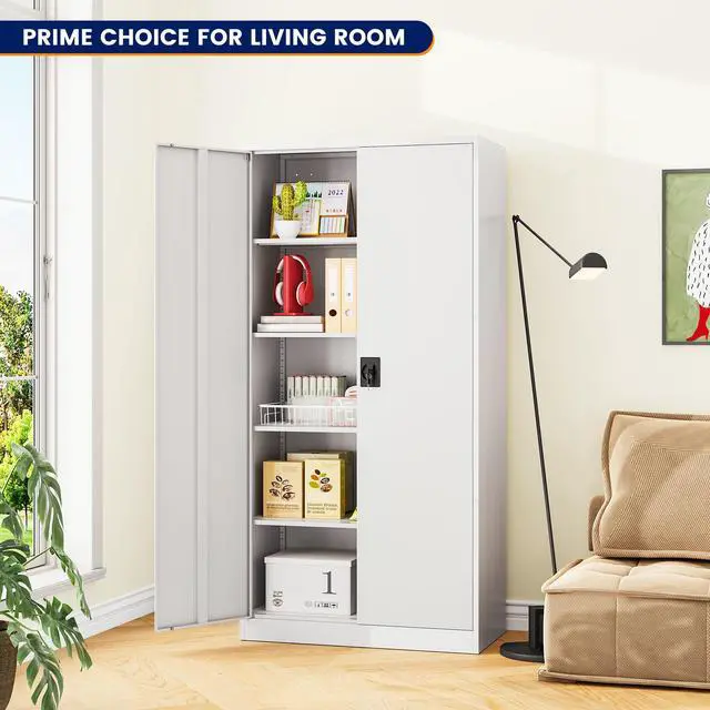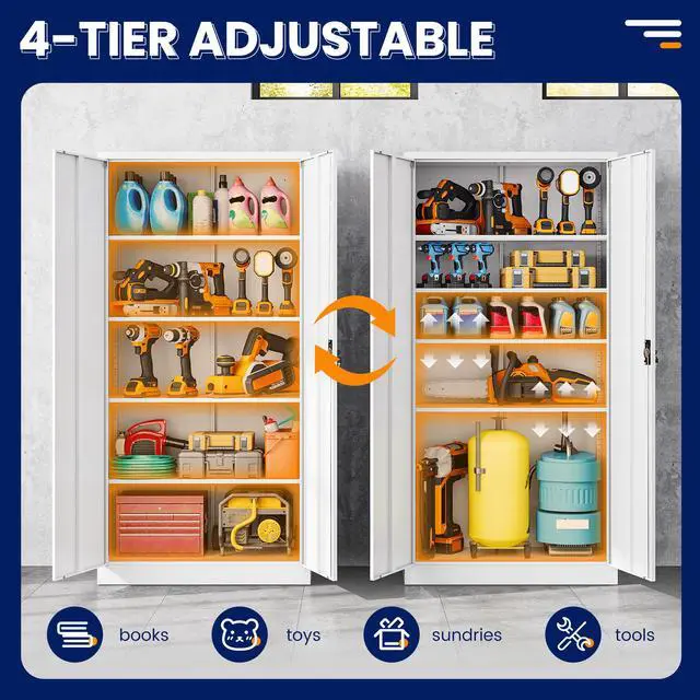 • Customizable StorageWith 4 adjustable shelves, this 71"H tall cabinet offers customizable storage for items of all sizes, making it great for storing tools, cleaning supplies, and vehicle accessories.