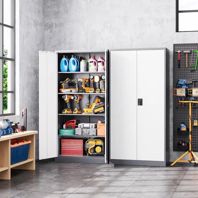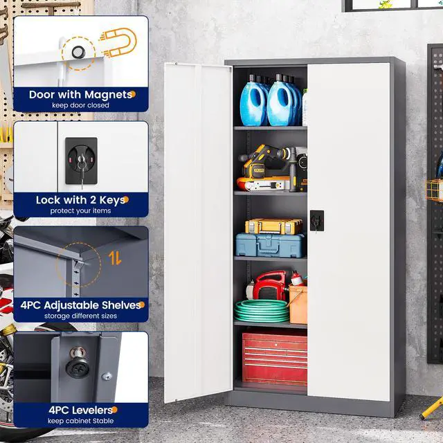 • Customizable StorageWith 4 adjustable shelves, this 71"H tall cabinet offers customizable storage for items of all sizes, making it great for storing tools, cleaning supplies, and vehicle accessories.