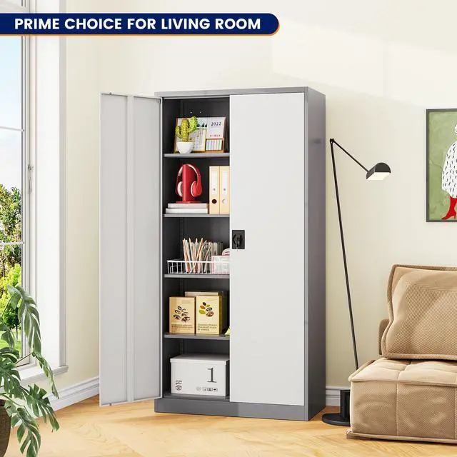 AFAIF Metal Garage Storage Cabinet with 2 Doors and 5 Adjustable Shelves - 71" Steel Lockable File/Locking Tool Cabinets for Office, Home, Gym, School Gray & White