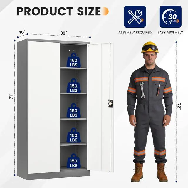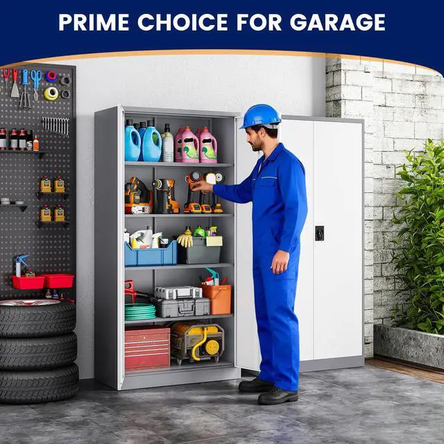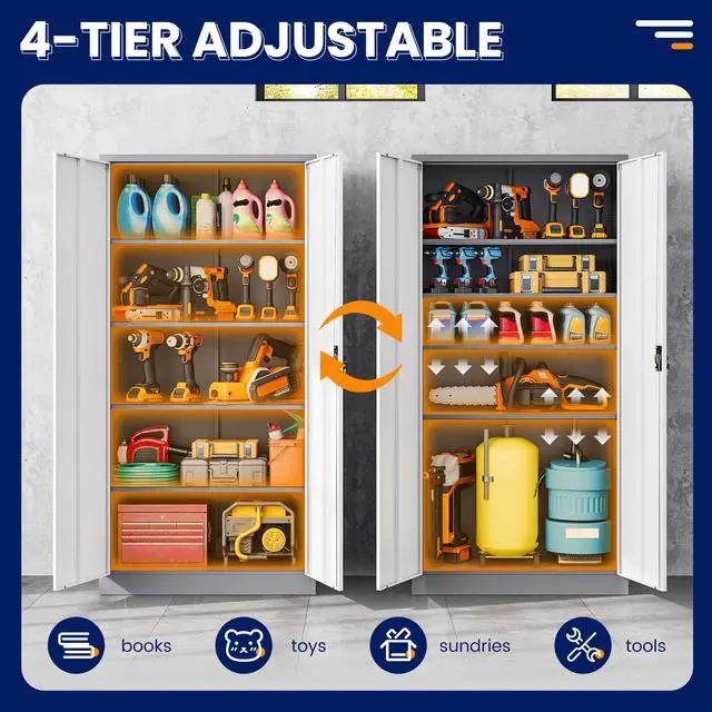 • Customizable StorageWith 4 adjustable shelves, this 71"H tall cabinet offers customizable storage for items of all sizes, making it great for storing tools, cleaning supplies, and vehicle accessories.