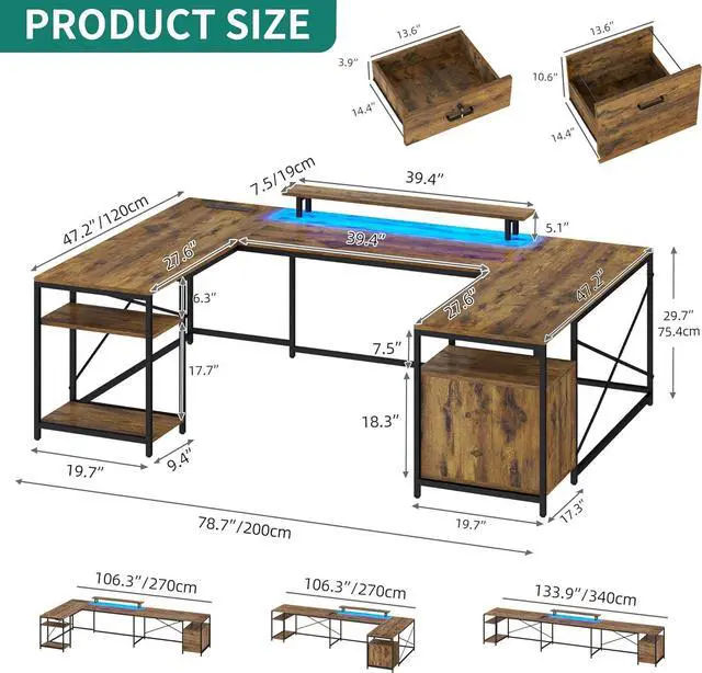 Personalized Workspace: Experience the freedom of arranging your workspace the way you want it! This L shaped computer desk can be installed as a 78.7" U-shaped desk, 106.3" left/right L-shape desk or 133.9" straight desk, tailored to fit various spaces and demands