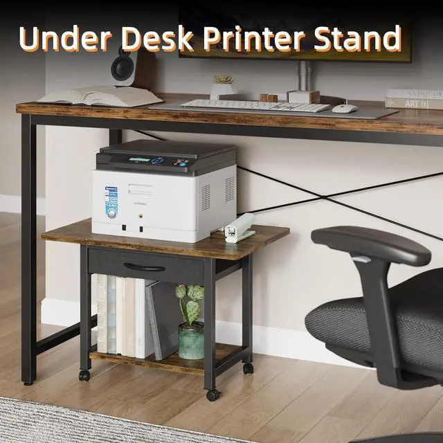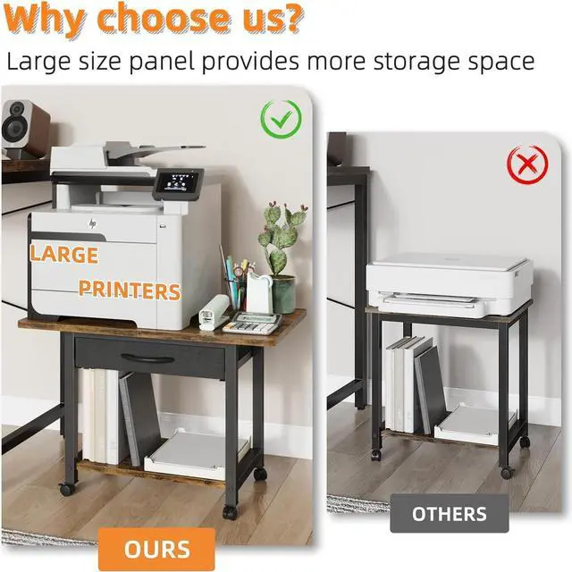 Large Printer StandSize: 22" L×15" W× 15.8 " H. Large spacious tabletop can fit most printers: fax machines, 3D printers, scanner and other office supplies. Not only a printer stand for desk, you can use it as a end table for the bedroom, living room, and a desktop organizer for your kithcen, office.
