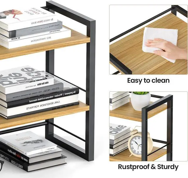 Easy Assembly-- Featuring a simple and easy installation, unlike other desktop bookshelves in the market, our bookshelf consists of two wooden boards and metal frame, allowing for a quick setup in just a few minutes.