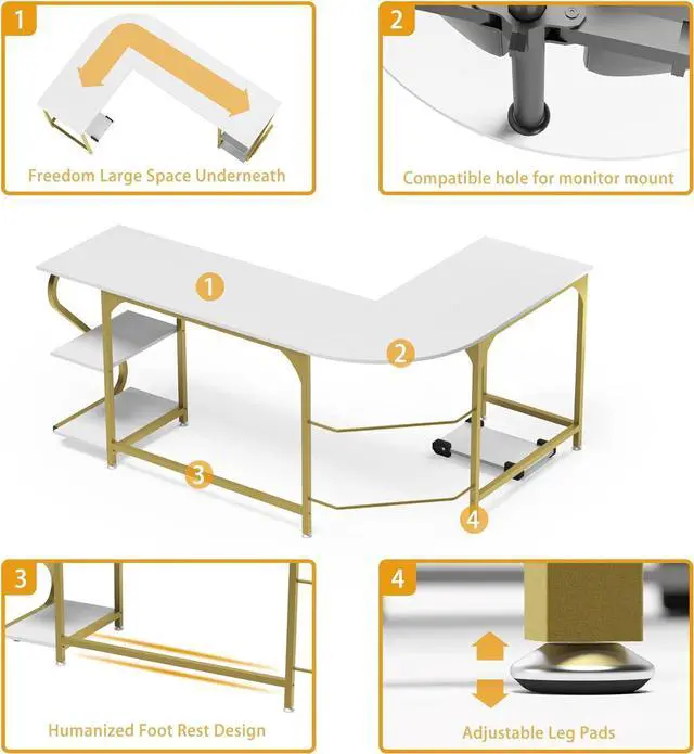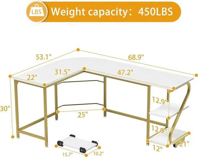 [Durable & Sturdy Wooden Desk] This l shaped gaming desk is made of quality P2 class Particle board & thicker strong steel frame to ensure maximum strength and durability. Bearing 450 LBS. Comes with adjustable leg pads to ensure the desk keeps sturdy even on uneven ground.