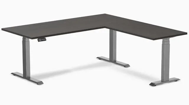 Desky Eco L-Shape Laminate Sit Stand Desk - Burnished Wood / 70.9 x 29.5 x 69.5 x 24 in / Space Gray