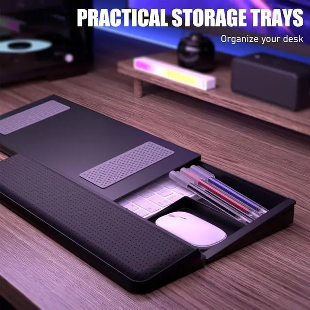 - Enjoy Ergonomics Bliss: Unmatched build quality and durability The keyboard stand for the desk is equipped with a wrist rest that is made of soft and breathable PU leather and high-quality acrylic panel brackets, Protect your body from neck and shoulder problems Experience the ultimate blend of style, comfort, and functionality, making every keystroke a symphony of productivity.