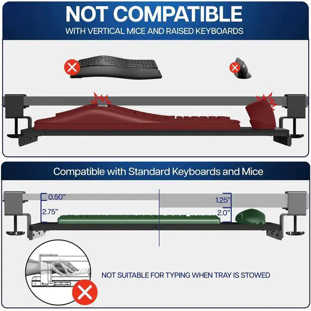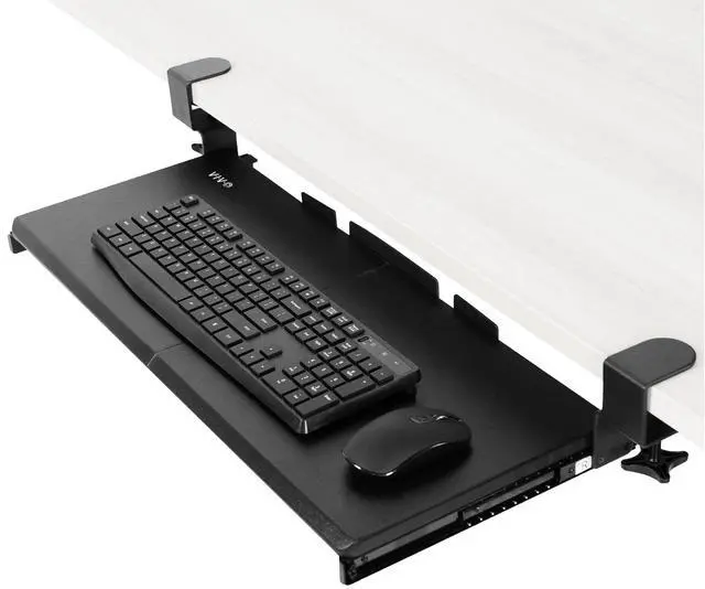 Free up desktop space and enjoy a more comfortable typing experience with this under-desk keyboard tray. Designed to hold your keyboard, mouse, and more below the desk surface, it helps create a clean, efficient workspace. Smooth sliding motion and ergonomic angles reduce wrist and shoulder strain, while sturdy C-clamps ensure easy, damage-free installation.