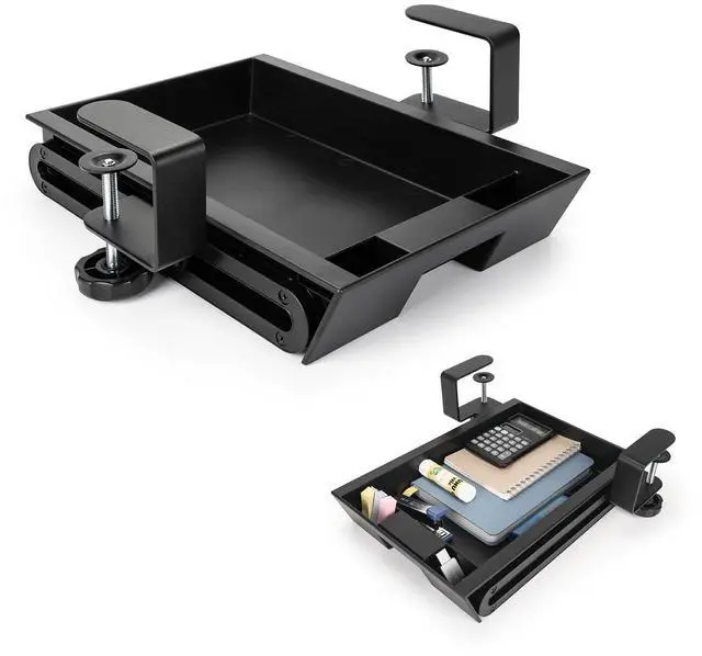 Quickly store pens, phones, or sticky notes in this clamp-on drawer. Smooth glide and easy access