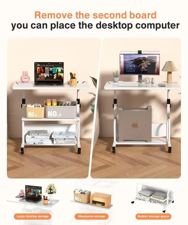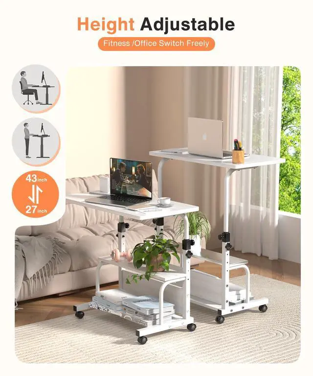 Portable Desk with Wheels Small Standing Desk on Wheels Adjustable Height Rolling Desks for Small Spaces, 32" Computer Desks with Storage Shelves for Home Office Study White