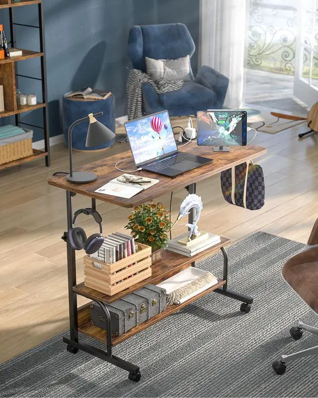 Armocity Height Adjustable Standing Desk with Power Outlets, 32" Manual Stand Up Desk with Storage Shelves Small Mobile Rolling Computer Desk Portable Laptop Table with Wheels for Home Office, Rustic