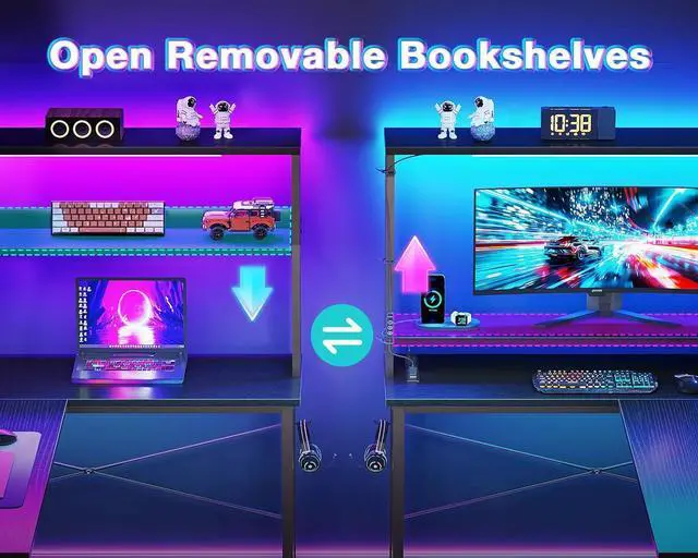 AODK Reversible L Shape DeskThis L shaped gaming desk comes with storage shelves, power outlet, light strip, CPU stand, headphone hook and storage bag. The L desk is reversible and the top hutch can be fixed on the left or right side according to your display needs, maximizing your limited space and ideal for corner spaces. A great choice for home office, game, office, studio and living room.