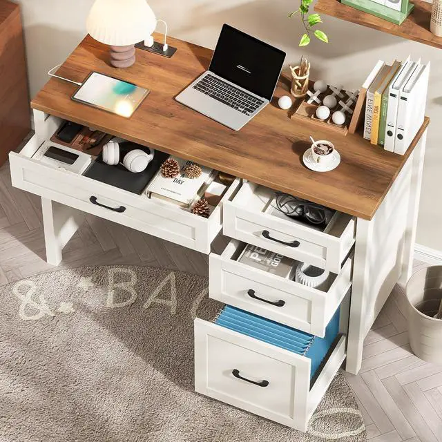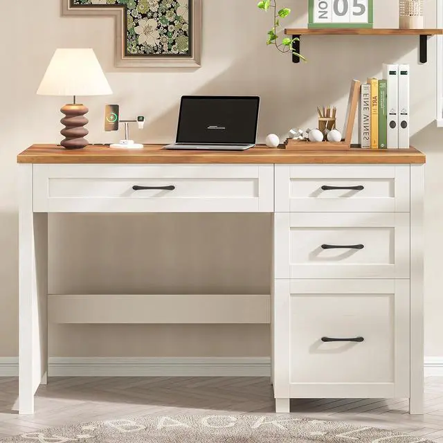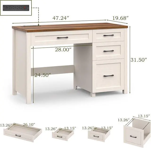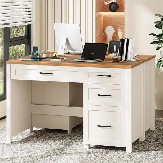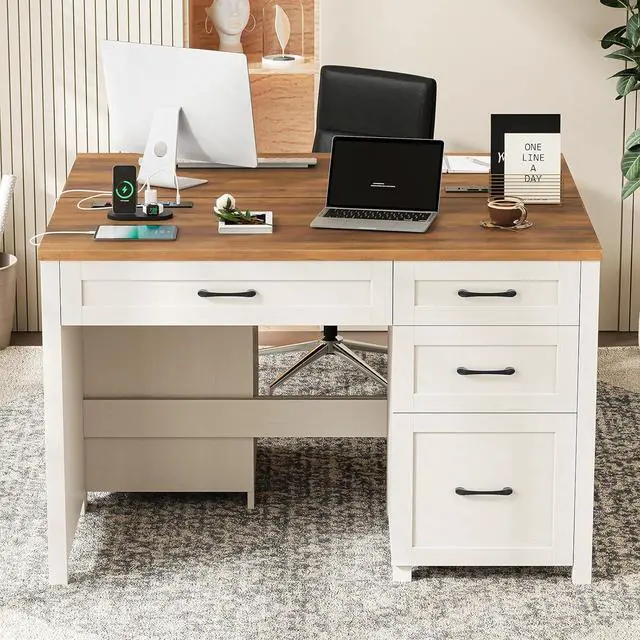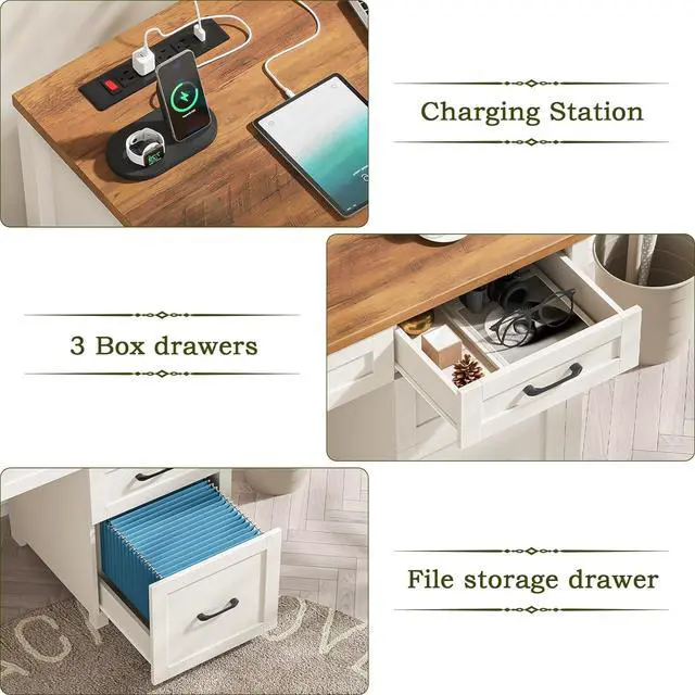 Vabches Farmhouse 47" Executive Desk, Computer Desk with File Drawer and Charging Station, Workstation for Home Office & Study.Unique White
