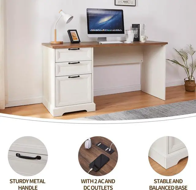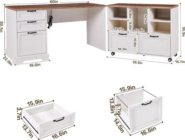 Stylish Combination Design Transform your workspace with this elegant L-shaped executive desk and file cabinet set. Featuring a rustic wood finish paired with white accents and unique decorative drawer patterns, it creates a cozy and natural ambiance. Perfect for homes, offices, or commercial spaces, it seamlessly blends into any environment while elevating the overall aesthetic.