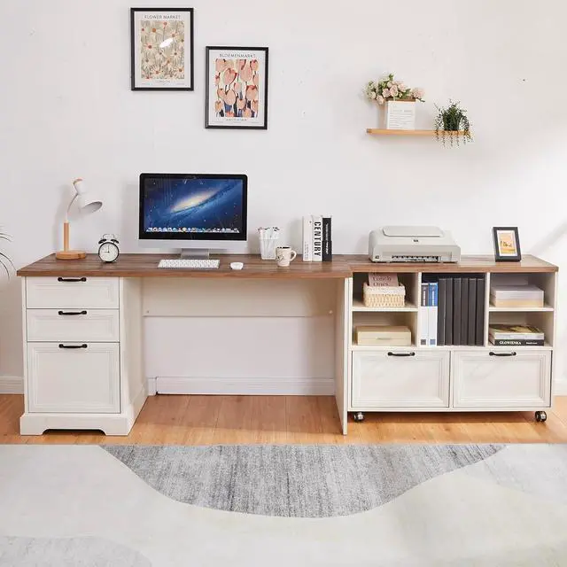 Ample Storage Space Stay organized with this thoughtfully designed desk and cabinet combo. The file cabinet offers two spacious drawers and five open shelves, while the desk includes two smaller drawers and a large filing drawer. Whether storing documents of various sizes or personal items, youll have plenty of room to keep everything neat and accessible.