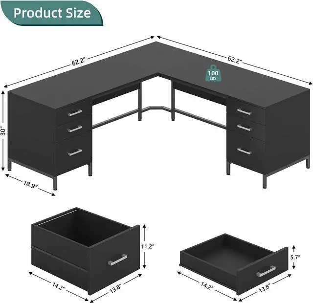 [Ample Storage Space] This 59 Inch corner computer desk combines a computer desk with 4 drawers, and there are also 2 large drawers for Letter-sized files. The overall dimensions of the table are 59' ' D x 59' ' W x 30' H. Let you have more sufficient space, make your desktop more neat and tidy, half the work, twice the effect