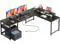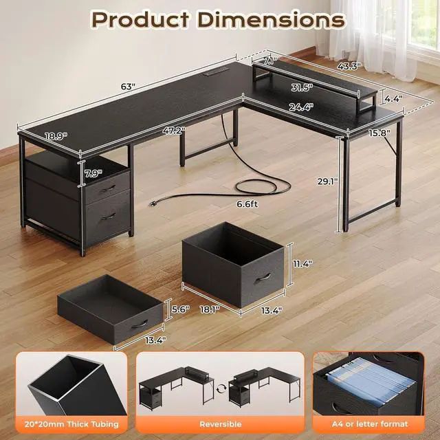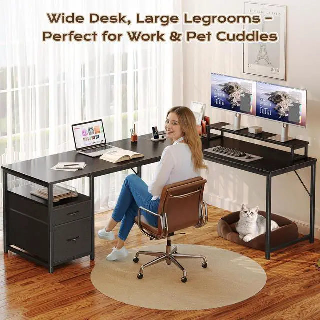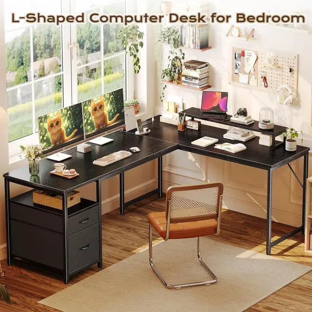 Reversible L Desk with Movable Monitor StandThe 18.9 -inch deep main desk and side table form a spacious L-shape, giving you spacious zones for work, study, or gaming. The elevated monitor shelf can be set up on the main or side desktop and helps store more and reduce neck strain by raising your screen to eye level, ideal for long hours of Zoom calls or editing work