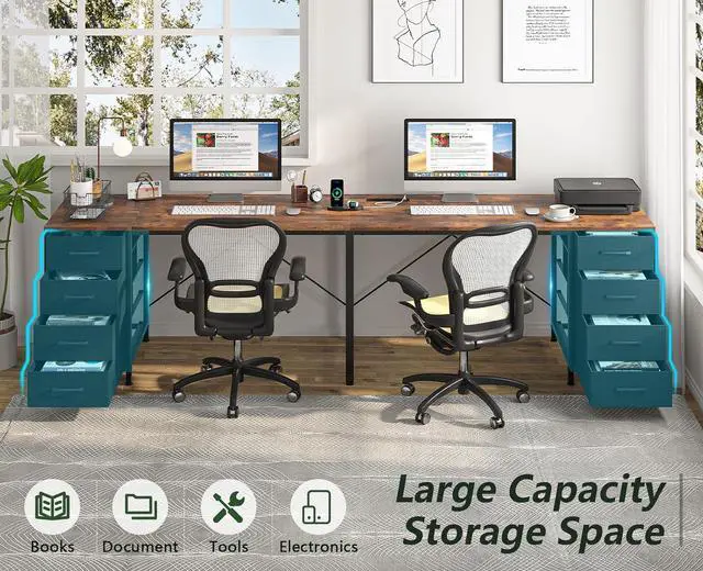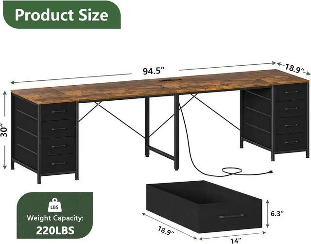 LARGE LARGE & LARGEThis 2-person computer desk comes with a large 94.5 -inch desktop to meet all the desktop needs of two people, and a large storage space with 8 drawers totaling 60 gallons of capacity to keep everything organized, while maintaining nearly 40 inches of large legroom to Keep both people comfortable