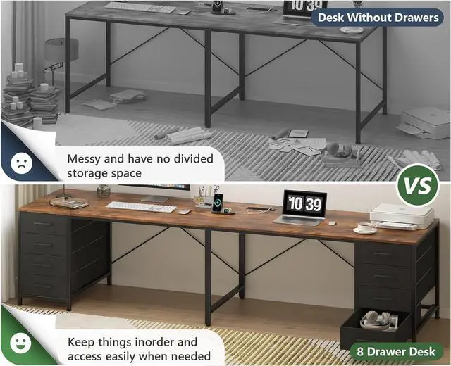 • LARGE LARGE & LARGEThis 2-person computer desk comes with a large 94.5-inch desktop to meet all the desktop needs of two people, and a large storage space with 8 drawers totaling 60 gallons of capacity to keep everything organized, while maintaining nearly 40 inches of large legroom to Keep both people comfortable