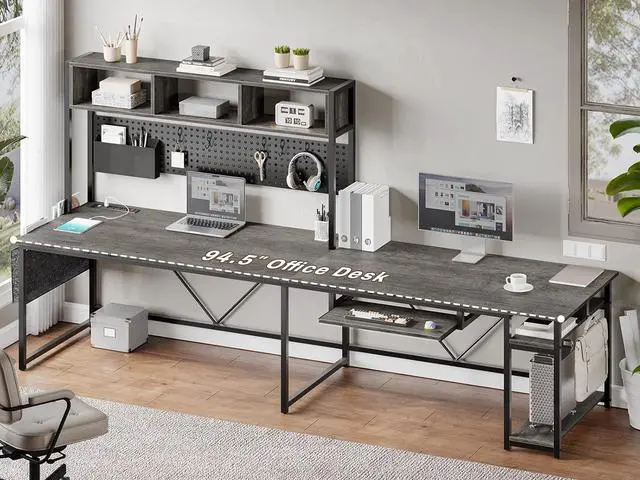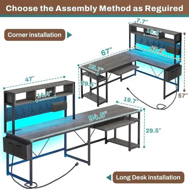 Reversible DeskReversible 67 inch corner desk or 94.5 inch long office desk: L Shaped desk is perfect for tucking into a corner, it can hold your computer, monitor, keyboard, files, books or CPU stand for a home office. A 94.5 -inch two-person desk can hold two-person studying or writing no interference. The top hutch can be placed left or right for your needs.