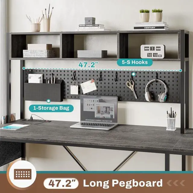 Ample Storage SpaceComing with a storage bag, peg board, 2-tier storage shelves, and keyboard tray with powerful storage space. The keyboard tray is ideal for the keyboard and mouse, which can free up more desk space. The top hutch can place files, and books, leaving spacious space for writing, paperwork, and other home office activities. This office desk provides enough room to study, work, or other office activities.