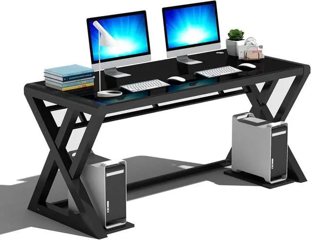 Modern Design: This gaming desk features a carbon steel frame in a classic X-shaped silhouette, blending style and function. An extra support bar under the thick tabletop adds stability, ensuring a solid workspace for your home office