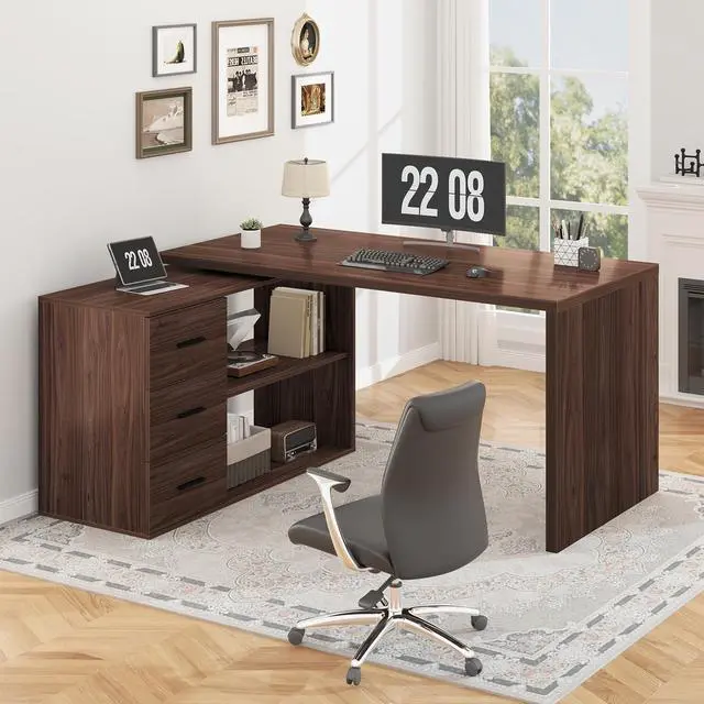 Keep Clutter out of Sight and out of Mind: The 2 tier open long shelves of the walnut l shape desk provide a place for essential office supplies at arms reach, while the 3 drawers let you tuck away anything from loose odds and ends to important files. The 360 rotating l shaped computer desk with drawers utilize maximally of your home office space and provide enough storage space.