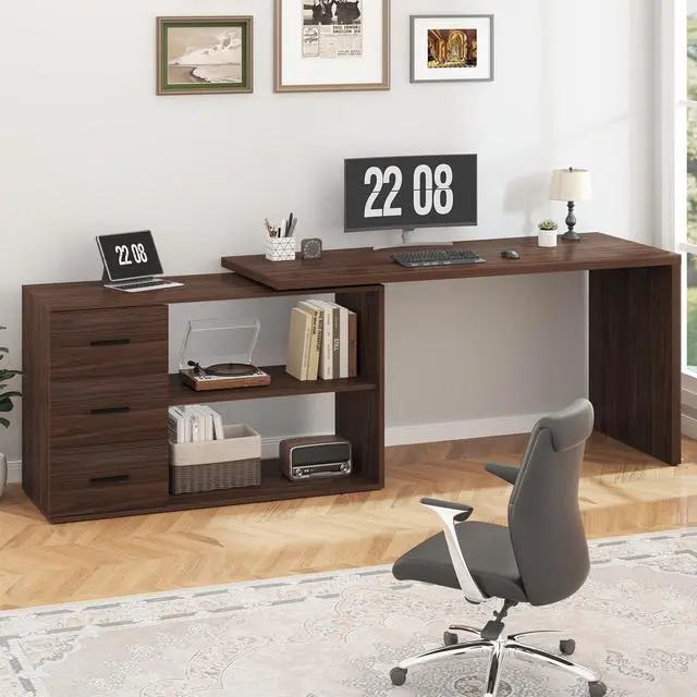 Rotating Design: This walnut l shaped Desk with Drawers and shelves is designed with 360° free rotating function, which allows you to change into different shapes to customize your computer desk. 0°overalapped perfect for small space, 90° or 270° L shaped perfect for corner space and 180° extended perfect for large space.