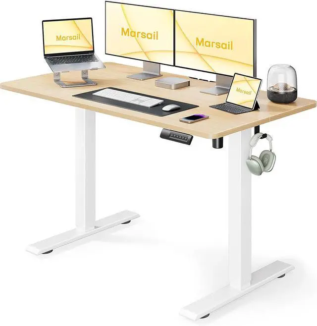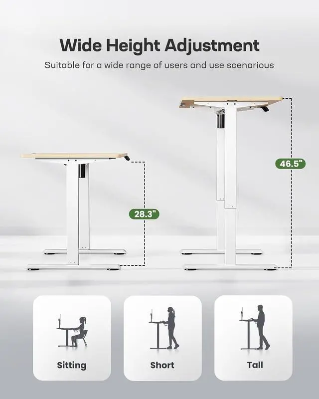 Flexible Height Adjustment: The Marsail standing desk' s adjustable height range from 28.3 ' ' to 46.5 ' ' facilitates switching between sitting and standing, combating the health issues of prolonged sitting such as leg swelling and waist fat accumulation. Users can adjust the height according to their needs, enabling a sit-stand work mode. It promotes better blood circulation and reduces muscle tension, offering a healthier work environment that boosts efficiency and safeguards spinal health.