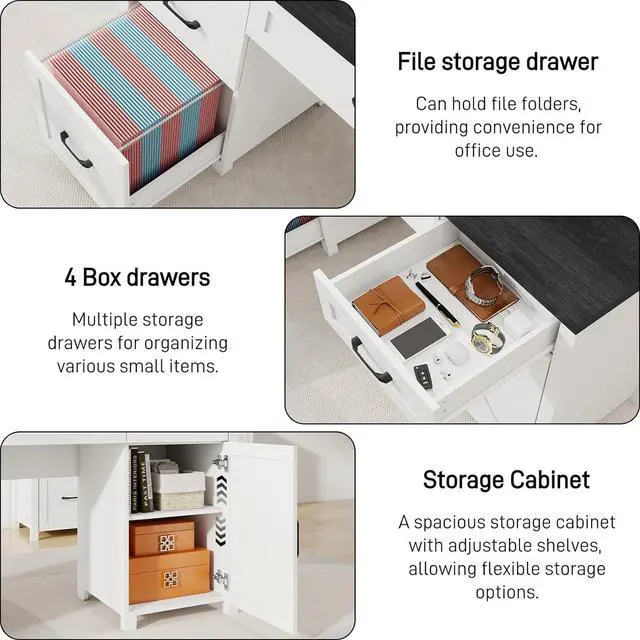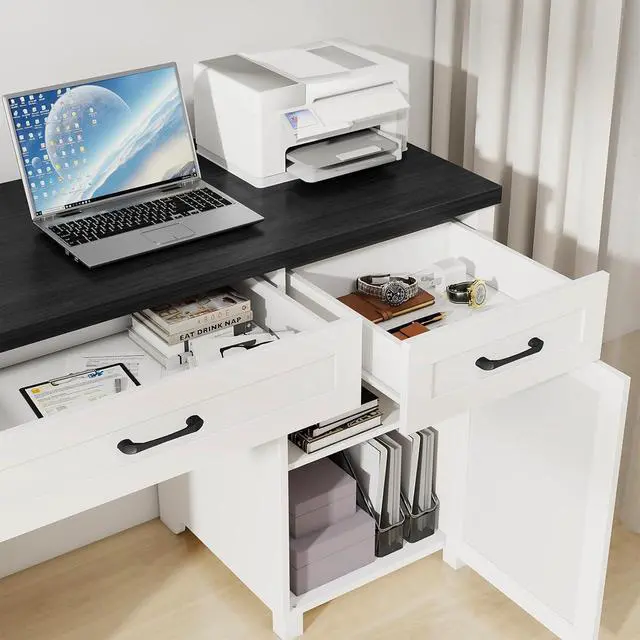 Abundant Storage CapacityMeasuring 61" in width and standing at 67" tall, this expansive executive desk offers enough space for files, computers, and printers. It includes five drawers, with dedicated file drawers that can hold both letter and A4-sized documents. Additionally, it features spacious storage cabinets, providing an organized solution for files, books, and other essentials.