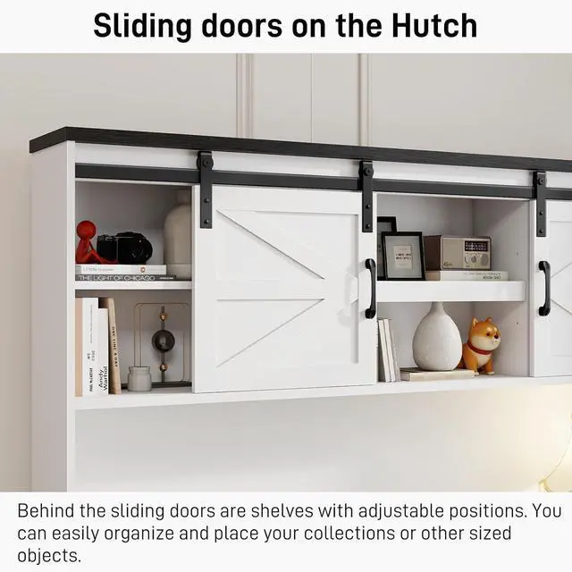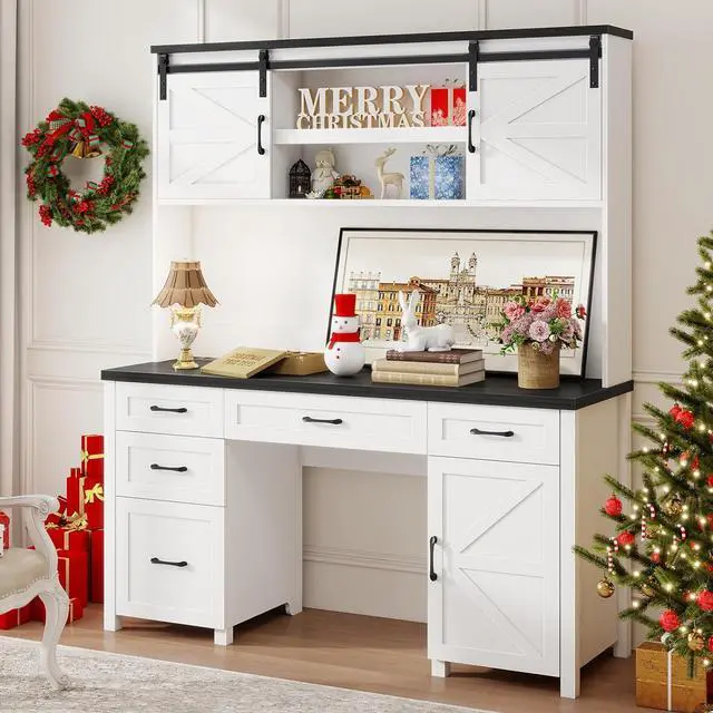 Rustic Farmhouse DeskThis elegant executive desk with a hutch and sliding barn-style doors embodies the charm of a farmhouse design, making it a superb addition to any home office setup. Featuring a spacious desktop and ample storage options, it promotes an organized and cozy workspace.