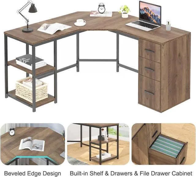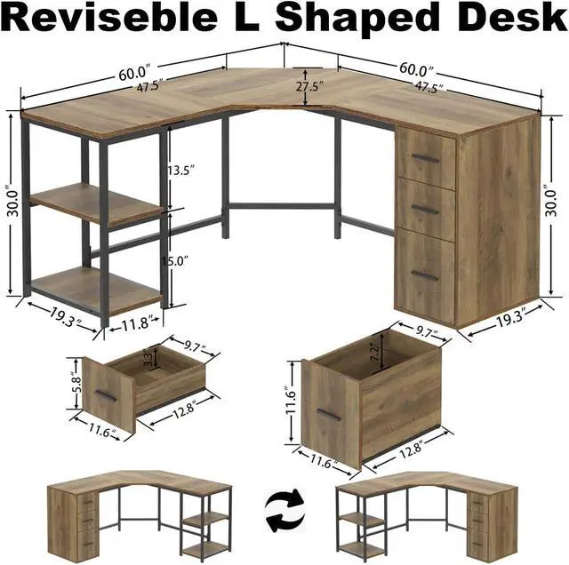 File Drawer Cabinet & Storage Shelves: Featuring ample storage and organization, our long computer desk includes two shelves and three drawers, including a secure file drawer cabinet for confidential documents. Dust-resistant drawers keep items organized and shelves offer easy access to office supplies. This reversible L-shaped desk with file cabinet maximizes functionality in your home, living room, bedroom, or office.