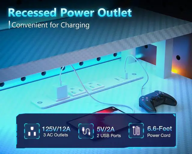 Stay Powered Up with USB Ports & Power Outlets. Never run out of battery again! This gaming computer desk comes equipped with 2 USB ports and 3 power outlets, allowing you to charge up to 5 devices simultaneously. Keep your smartphone, gaming gear, and other electronics powered up while you play, work, or study. The strategically placed power outlet and USB ports add convenience to your daily routine, ensuring your devices are always ready to go.