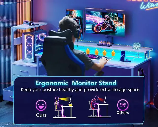 Ergonomic Design for Comfort & Health. Protect your posture and enhance your comfort with the built-in monitor stand. This feature raises your screen to an ergonomic height, reducing neck and spine strain during long gaming sessions or work hours. The monitor stand also creates extra space on your desktop, keeping it tidy and organized. Whether you' re gaming, studying, or working, this desk ensures you stay comfortable and focused.