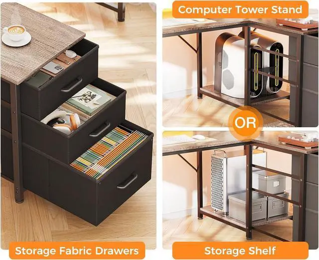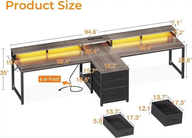 Powerful Storage Function & Large WorkspaceFeaturing 2 fabric drawers, a file cabinet, and an open storage shelf that is large enough to hold 2 computer towers, this computer desk allows for a ample storage space to keep your belongings organized and easily accessible. The 94.6 " (L) x 19.6 " (D) desktop is spacious enough to accommodate your monitor, keyboard and other items without sacrificing your workspace and desktop neatness.