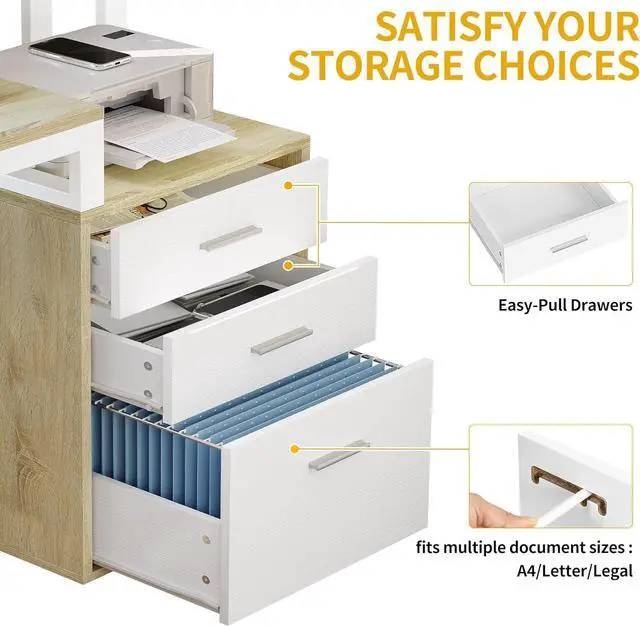 L Shaped with Storage Cabinet: 2-in-1 corner desk combines a computer desk with file cabinets featuring 1 file drawer for letter, A4, legal size files, 2 drawers for small office supplies, and 4 open storage shelves for more office essentials. Also, the printer stand for printers, scanners, fax machines or any other office machines within your reach to improve working efficiency