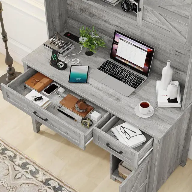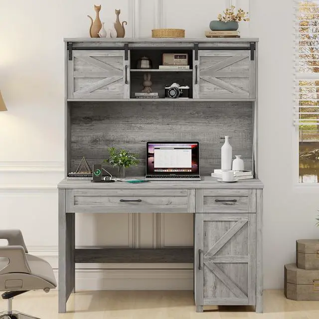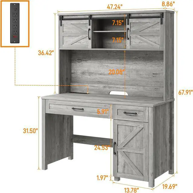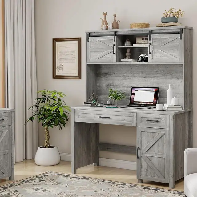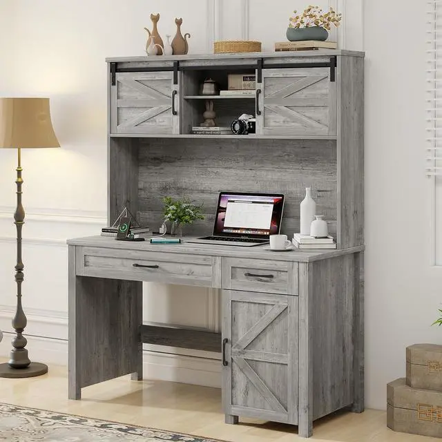 Charming Rustic Farmhouse DeskThis elegant executive desk, complete with a hutch, captures the essence of farmhouse charm and is an excellent addition to any home office. With its spacious work surface and extensive storage, it creates an organized, inviting environment. The desks generous size and flexible design make it a top choice for those seeking both style and function in their workspace.