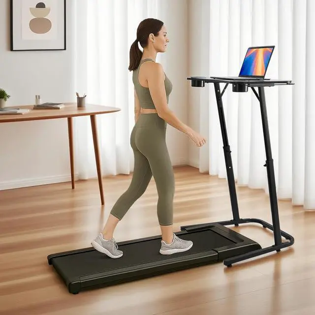 Multifunctional Walking Pad DeskThis treadmill desk features a curved design for a more stylish look. The desktop includes two cup holders for drinks, sodas, coffee mugs, or cup holders. The tablet slot design makes it easy to secure your tablet, and the towel rack on the desktop provides a convenient place to organize headphones or store towels.