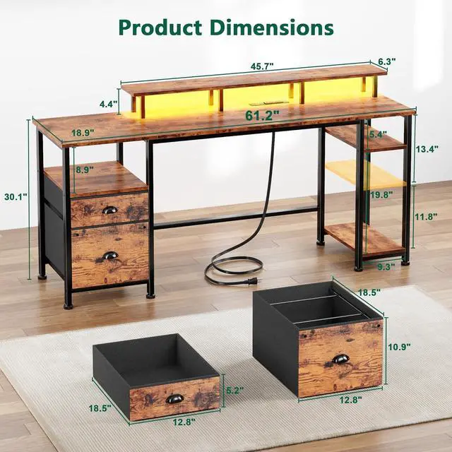 Large Desk for Ample Storage Space: 60" long desktop can accommodate 2 displays and one printer, providing sufficient space for home office work; 3 open storage shelves, 1 fabric file cabinet and drawer increase additional space to meet different storage requirements for making your desktop more organized.