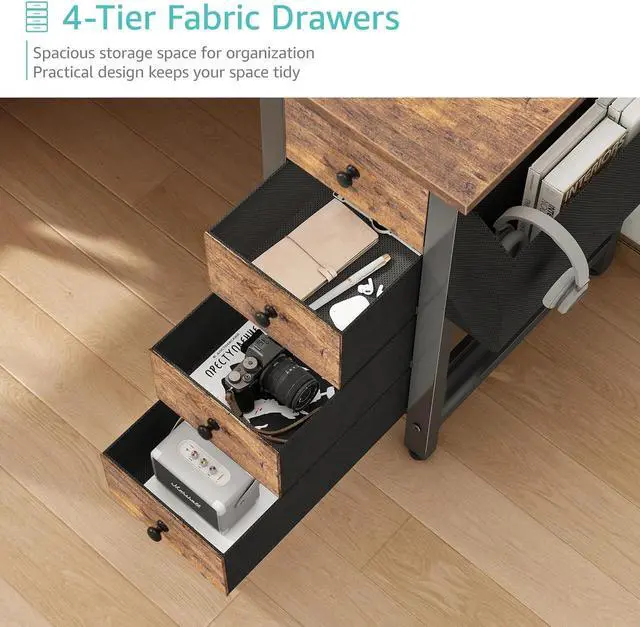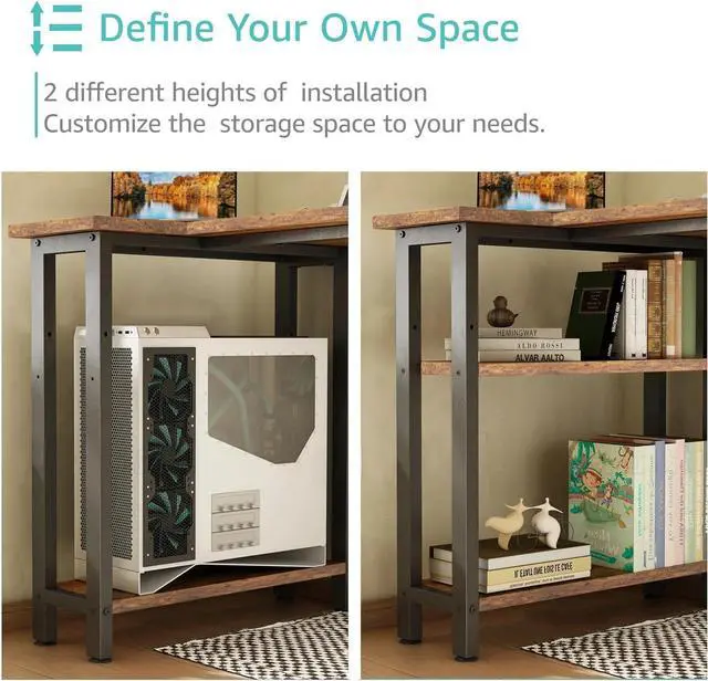Vintage Style Design: Computer desk with 2 storage shelves and 4 with wooden front, you can try this two installation methods (left or right), and the shelves have two different heights of installation, you can customize the storage space to your needs. This desk is made of thick P2 particle wood board with scratch-resistant, anti-collision and waterproof, protect home office desk surface from daily wear and tear.